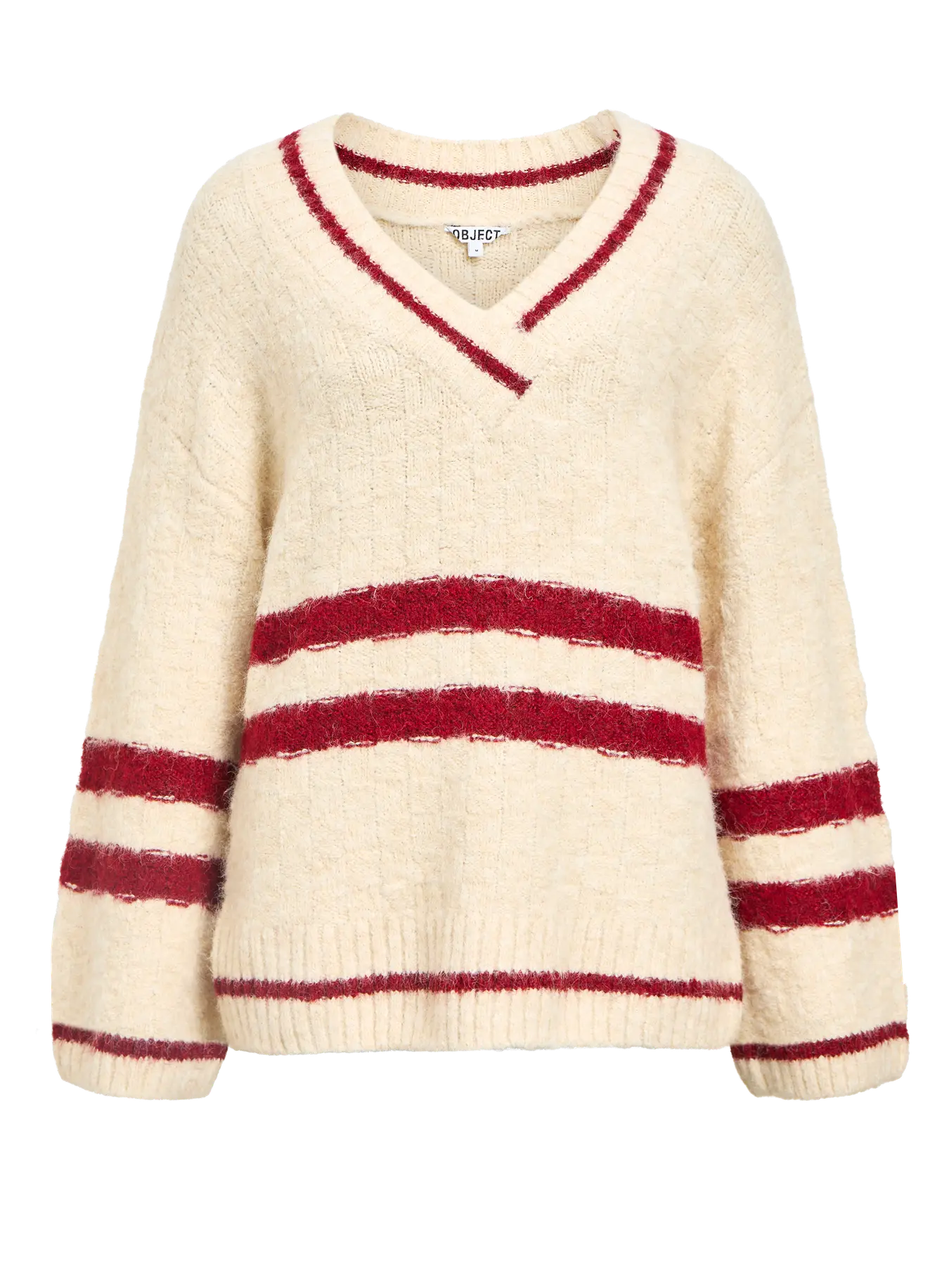 Flörtar med collegetröjan gör denna stickade snygging ifrån Object. Offwhite botten med en härlig röd rand. Oversized modell.
