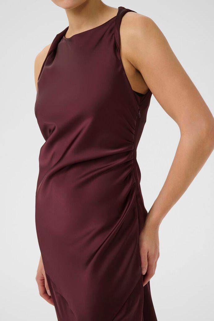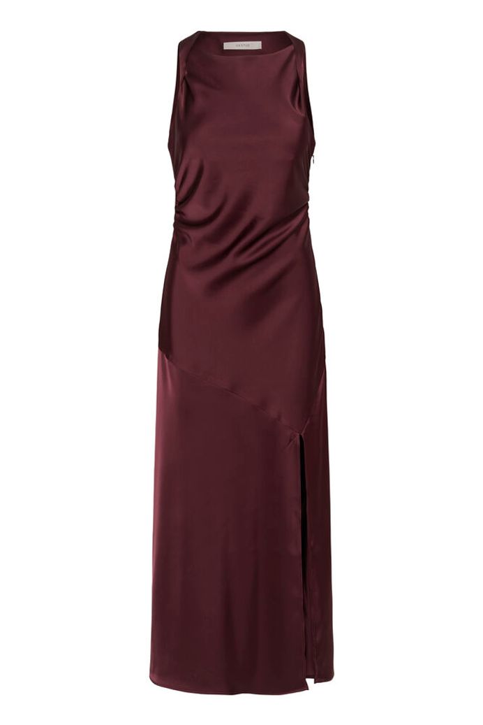 Fina klänningen i underbar vinröd färg! Fin detalj på axelbanden i form av en vridning. Går högt upp i ryggen. Draperad i sidorna och knäpps med dragkejda i ena sidan. Kommer ifrån Gestuz.