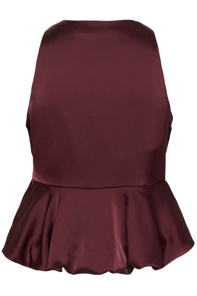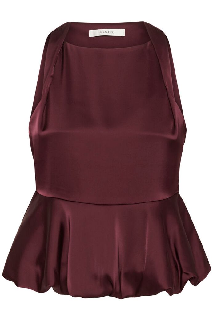 Så fint linne med vridna band och lite peplum modell (avskuren midja med volang nedtill) Ifrån Gestuz. I blankt material som gör den festlig. Matcha med byxan för ett helt set!