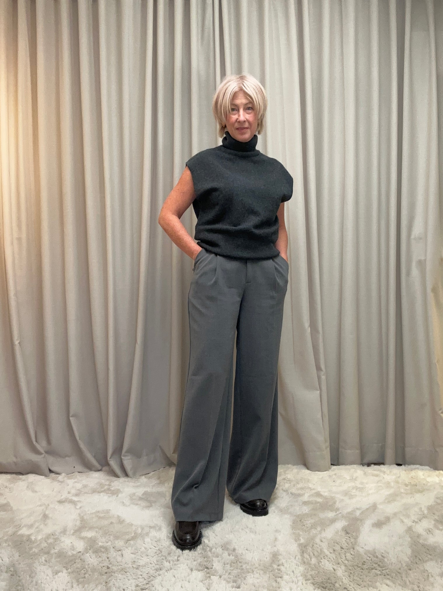 Parallellt med brunt och vinrött ser vi mycket grått . Och den är en fin färg att kombinera med just brunt och vinrött. Men här har vi valt en helt monokrom look. Att bära samma färg på överdel och underdel blir alltid stilsäkert. Ivy pants från Object med skön vidd och motveck under linningen tillsammans med ursnygga ärmlösa toppen , Manzi med polo från Gestuz. Du köper dom här i webshopen.
