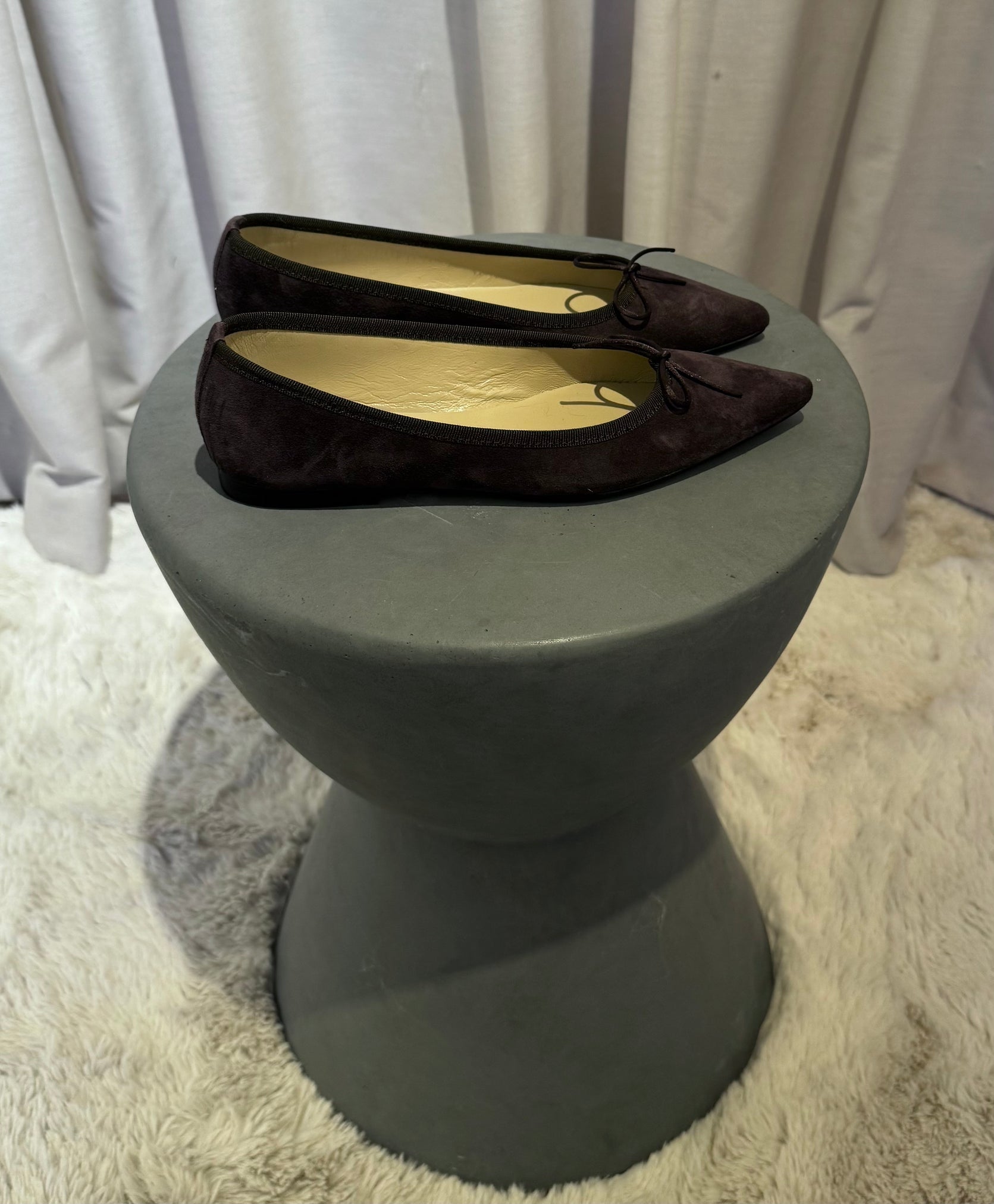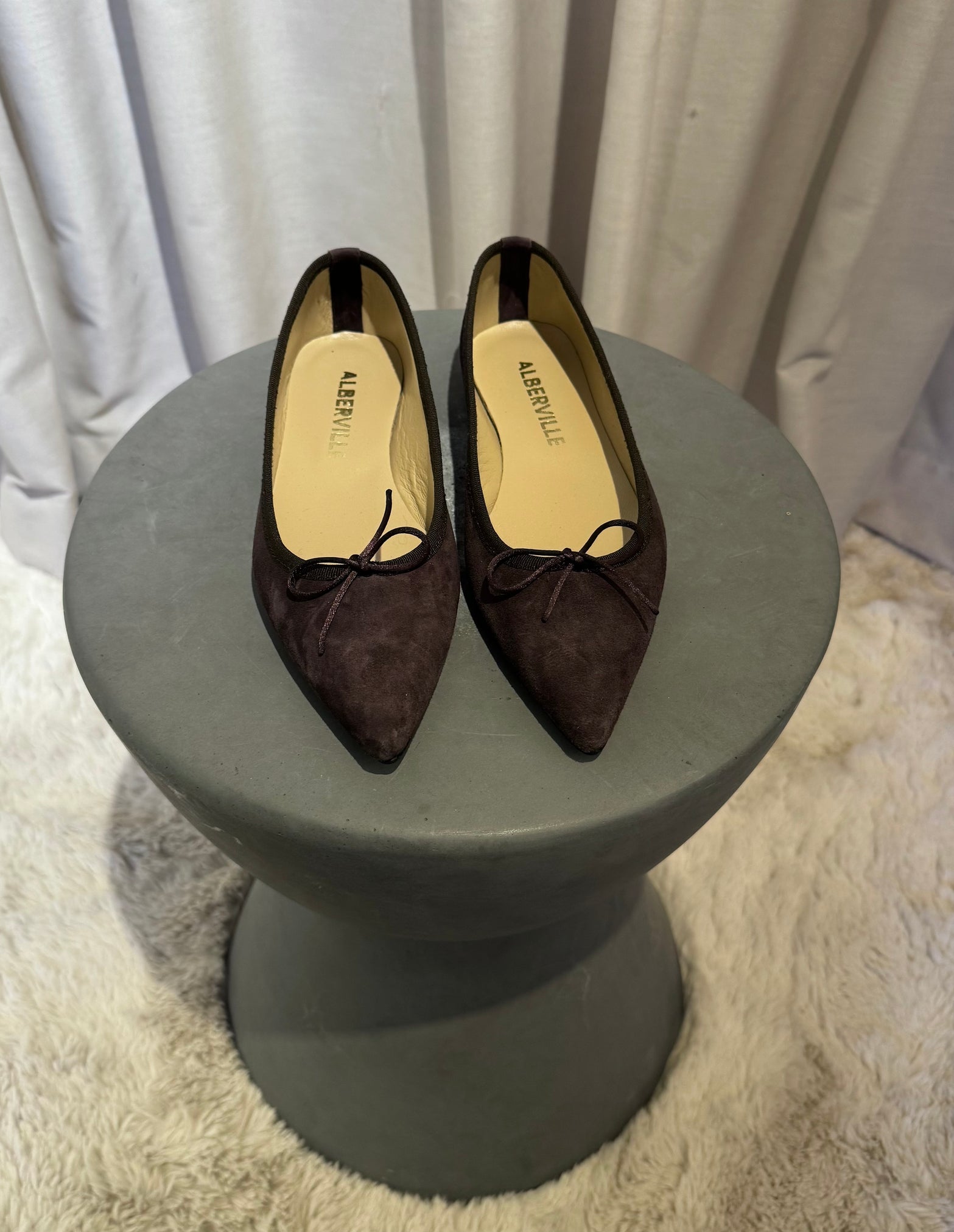 Ursnygg ballerina med spetsig tå i mörkbrun mocka från Alberville. Klassisk knytband fram i ringningen på skon, låg klack på 1,5 cm. Alberville tillverkar sina skor i Italien i fina skinn med riktigt bra kvalitet och bekväma läster.