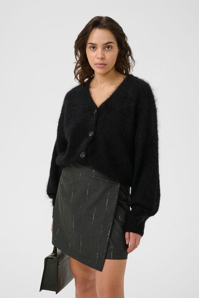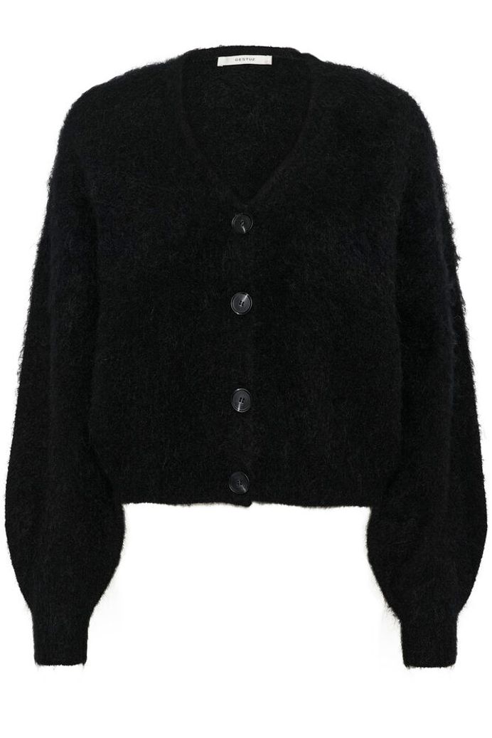 Gestuz är nytt märke hos oss i höst. Och här är en av deras klassiska koftor i mjuk fluffig mohair i en kort modell. Färg: Svart