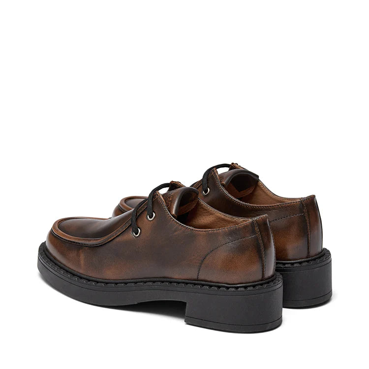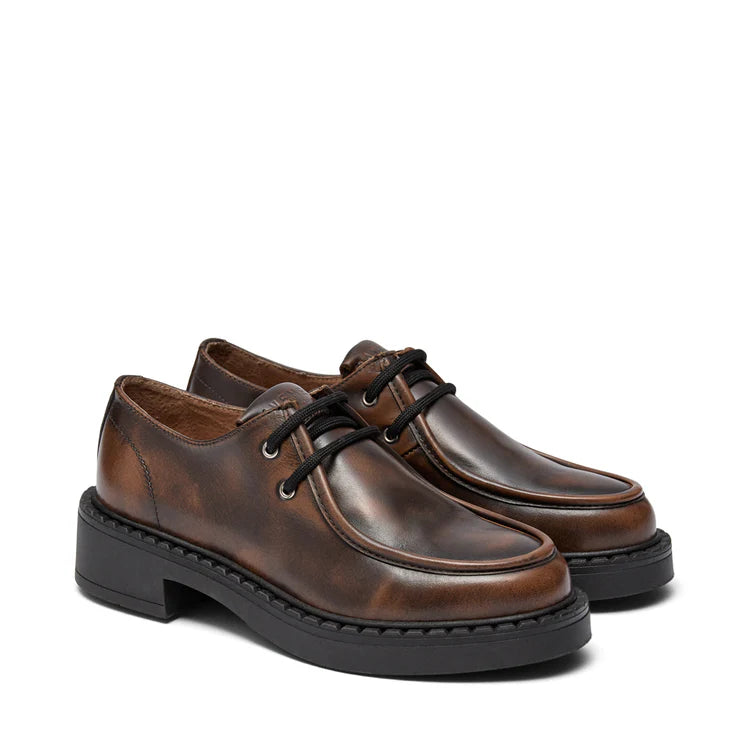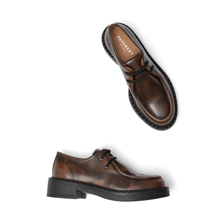 En ny snygg sko ifrån Pavement i ett skiftande brunt skinn. Svarta runda skosnören och svart lite tjockare sula.
